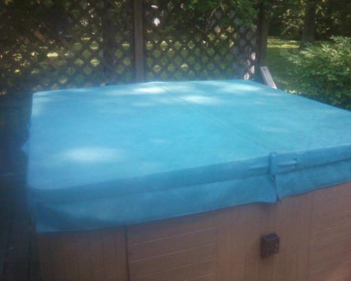 Cover for Hot Tub. Light Blue Heather, measures 81 x 76, diagonal 107, 5 skirt, round corners. Great condition and taken care of. Three years old. Paid 325.00.